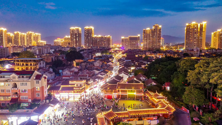 夜幕降临,熙熙攘攘的人群在漳州古城街头巷尾穿梭。霓虹闪耀映衬着商铺的各式招牌,让这里的夜充满了独特的魅力。沈昊鹏 摄
