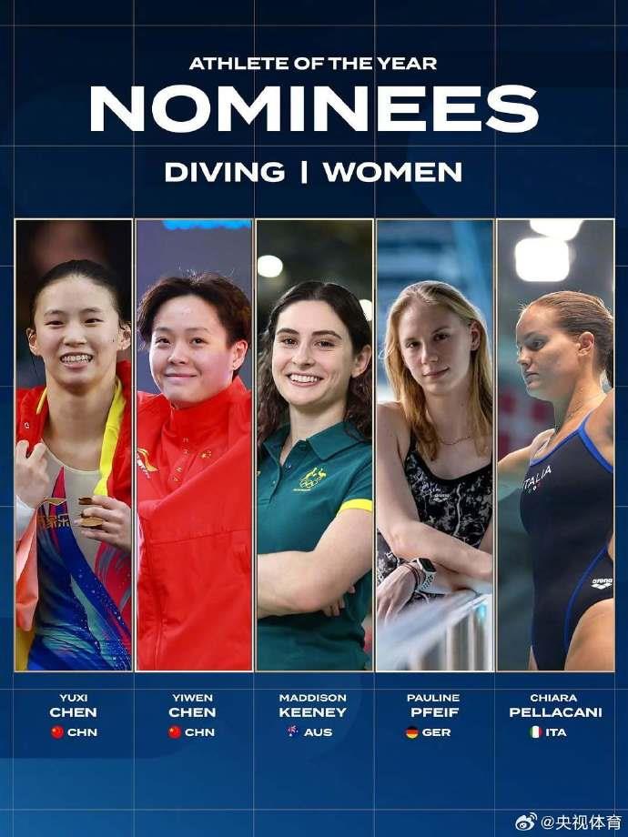 世界泳联公布年度最佳女子跳水运动员候选名单,中国选手陈芋汐、陈艺文入围。陈芋汐凭借在新加坡世锦赛斩获女子单双人10米台及混合团体三金的佳绩,成为奖项的有力竞争者。