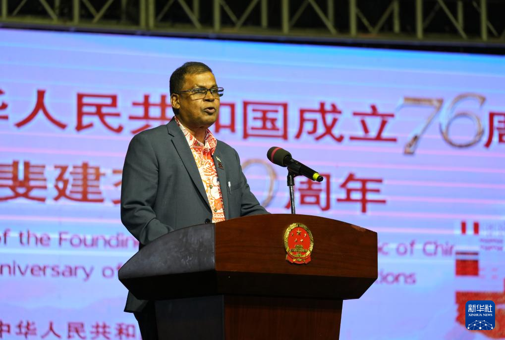 9月27日,斐济代总理兼财政、战略规划、国家发展和统计部长比曼·普拉萨德在苏瓦举行的庆祝中华人民共和国成立76周年暨中斐建交50周年活动上致辞。新华社发(高鑫摄)