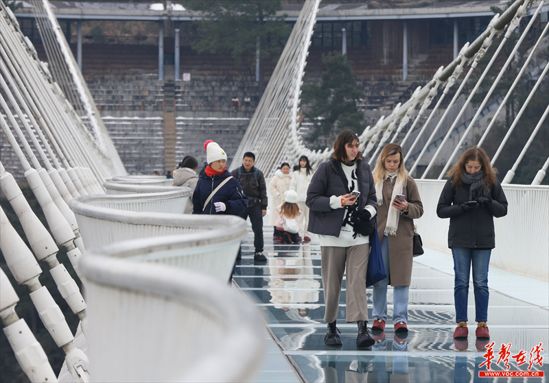 外国游客在张家界大峡谷玻璃桥游玩。(吴勇兵 摄)