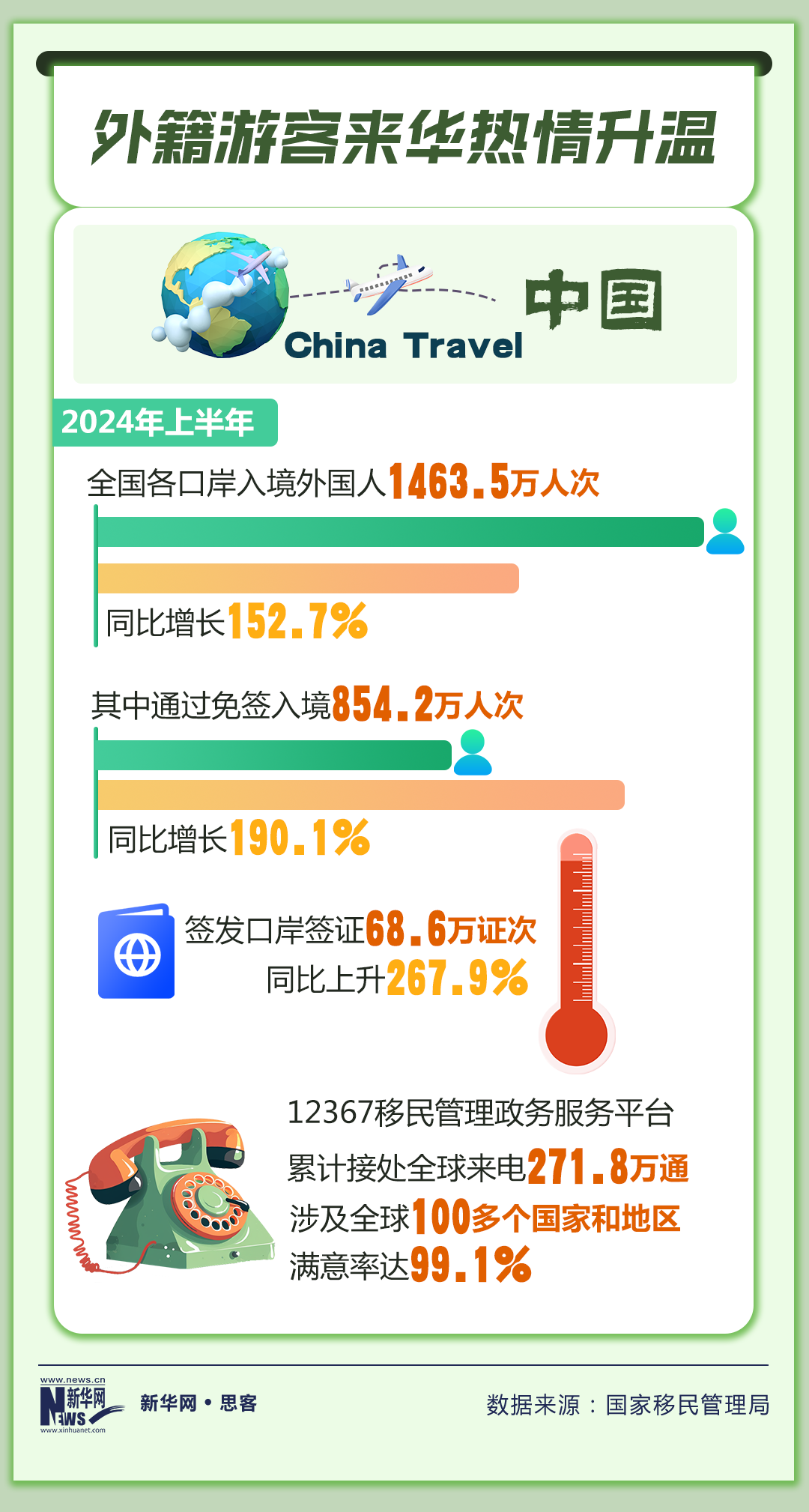 随着免签“朋友圈”持续扩容,入境游客数量激增。据国家移民局数据统计,上半年全国各口岸入境外国人1463.5万人次,同比增长152.7%。其中通过免签入境854.2万人次,占比52%,同比增长190.1%。签发口岸签证68.6万证次,同比上升267.9%,为在华外国人办理停留居留证件38.8万人次,同比增长2.4%。