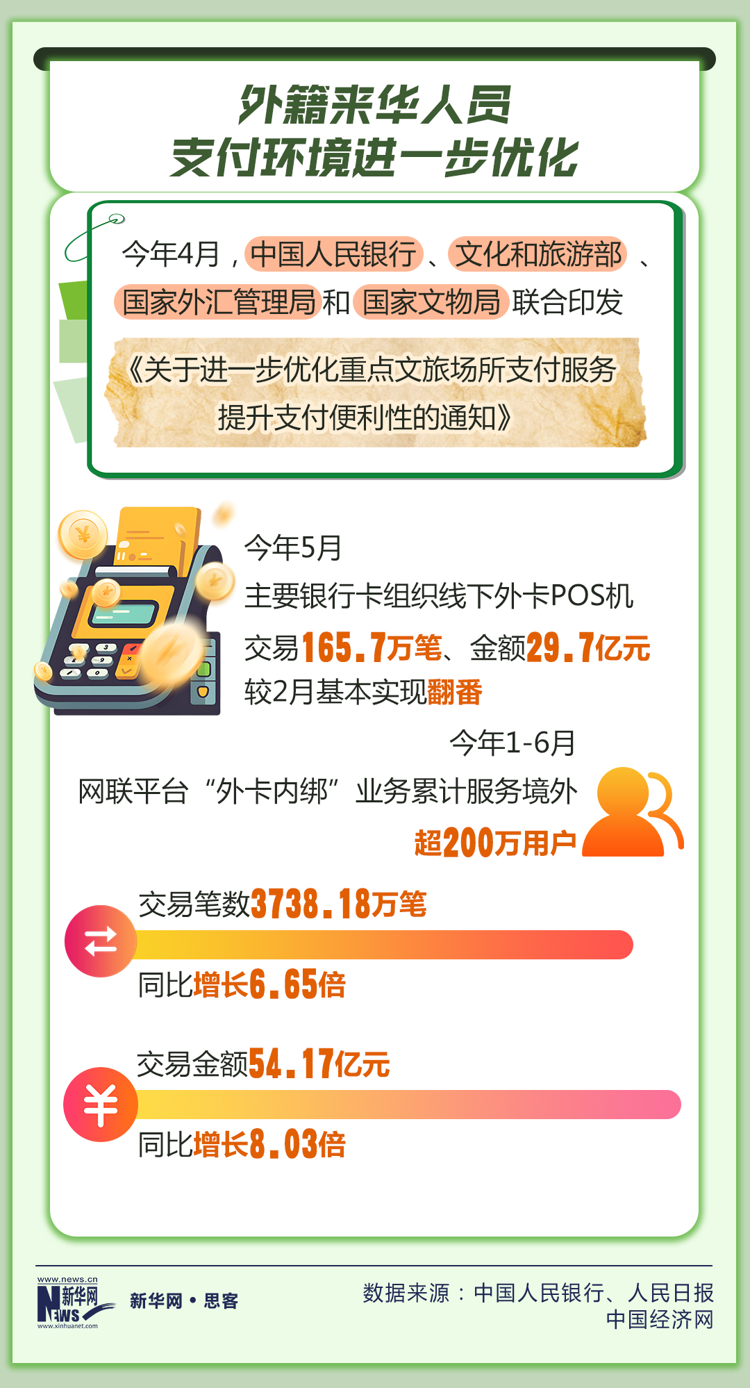 一方面,围绕入境游存在的“堵点”,多部门聚焦优化旅游服务体验,打造对外国人更友好的消费环境。今年4月,人民银行、文旅部等四部门联合印发通知,要求重点文旅场所实现境内外银行卡受理全覆盖,同时保障能够用现金支付兜底。最新数据显示,2024年5月,主要银行卡组织线下外卡POS机交易165.7万笔、金额29.7亿元,较2月基本实现翻番。同时,今年以来,网联清算公司联合商业银行、支付机构、卡组织等经营主体优化外籍来华人员移动支付服务,创新和推广“外包内用”“外卡内绑”业务,让外籍来华人员也能享受便捷安全的移动支付服务,感受中国数字经济的发展成果。数据显示,今年1-6月,网联平台“外卡内绑”业务累计服务境外超200万用户;交易笔数3738.18万笔,同比增长6.65倍;交易金额54.17亿元,同比增长8.03倍。
