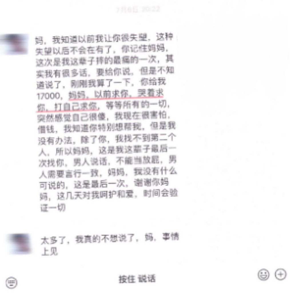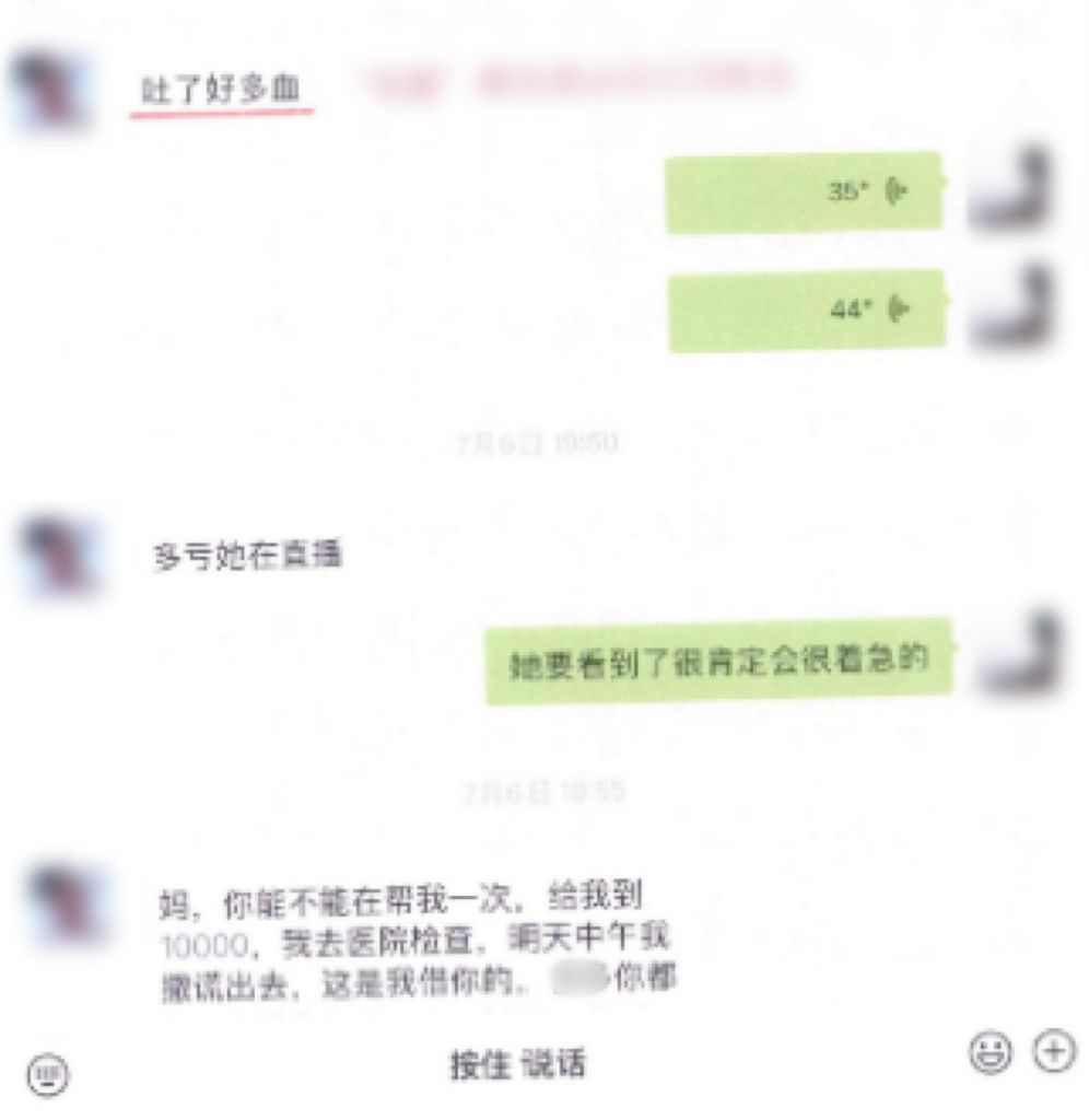 时间长了,高阿姨产生了些许怀疑,到2022年5月时,高阿姨不再理会马某的消息,但马某可不会轻易放过到嘴的“肥肉”。他声称高阿姨的不理会导致他旧疾复发大量吐血,如今已时日不多,随后一边发送伪造的急救单据和病历提升自己患病的可信度,一边屡屡发出诸如“医生非让我住院,我不住,我只有你一个妈”“妈妈,你知道你对我多重要,我随时可能会走”等消息,试图以情感攻势挽回高阿姨。