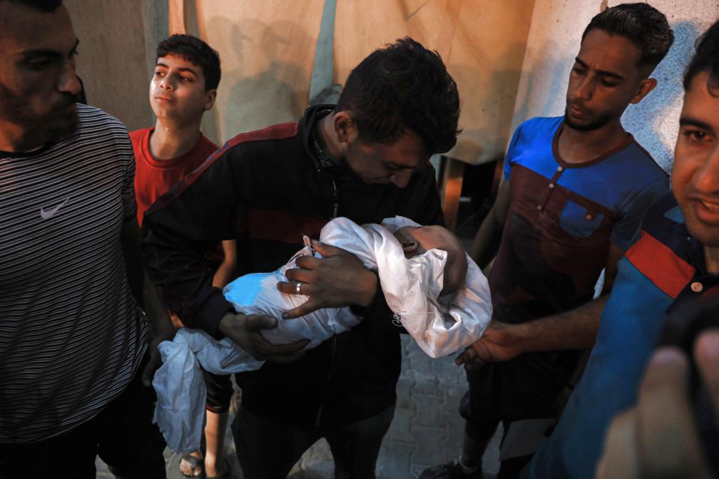 5月7日,在加沙地带南部城市拉法的一家医院,一名男子抱着在以色列空袭中丧生的儿童。新华社发(里泽克·阿卜杜勒贾瓦德摄)