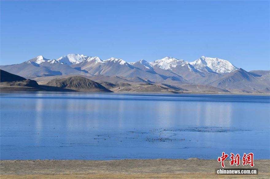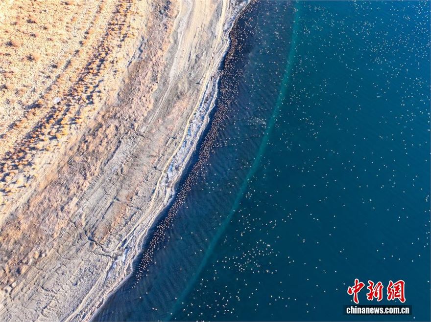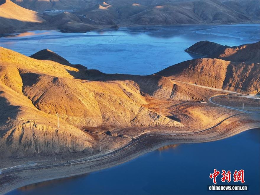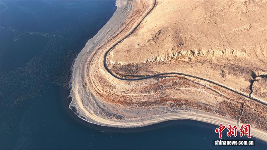 1月18日,西藏羊卓雍错流域沉错风光。(无人机照片)沉错地处西藏羊卓雍错东部,是羊卓雍错水系重要组成部分,湖形狭长、湖水深邃,因湖底地形复杂得名。作为羊卓雍错流域内关键生态区域,沉错已成为众多候鸟越冬的乐园。