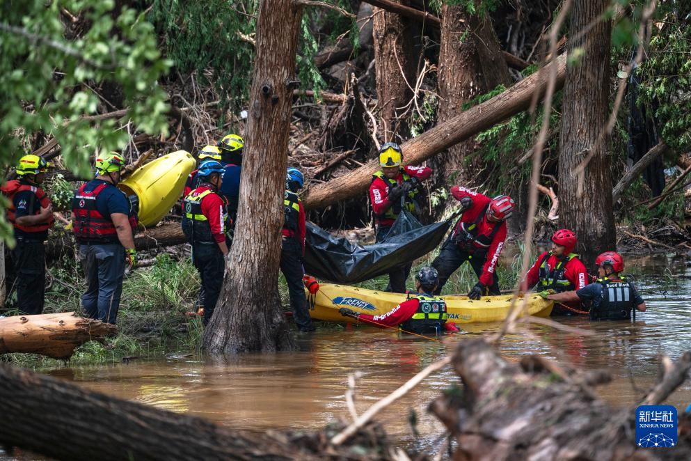 7月7日,救援人员在美国得克萨斯州英格勒姆遭洪水侵袭的区域搬运遇难者的遗体。新华社/美联