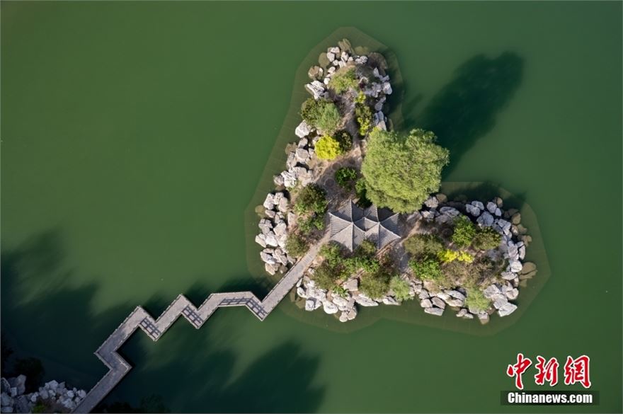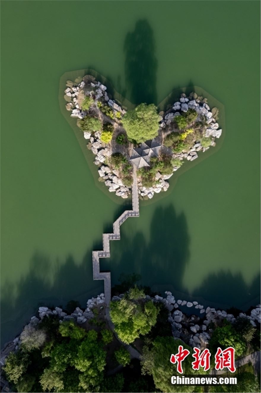 4月25日,山西省太原市,从高空俯瞰,晋祠公园九龙湖湖心岛呈“爱心”形状。(无人机照片)