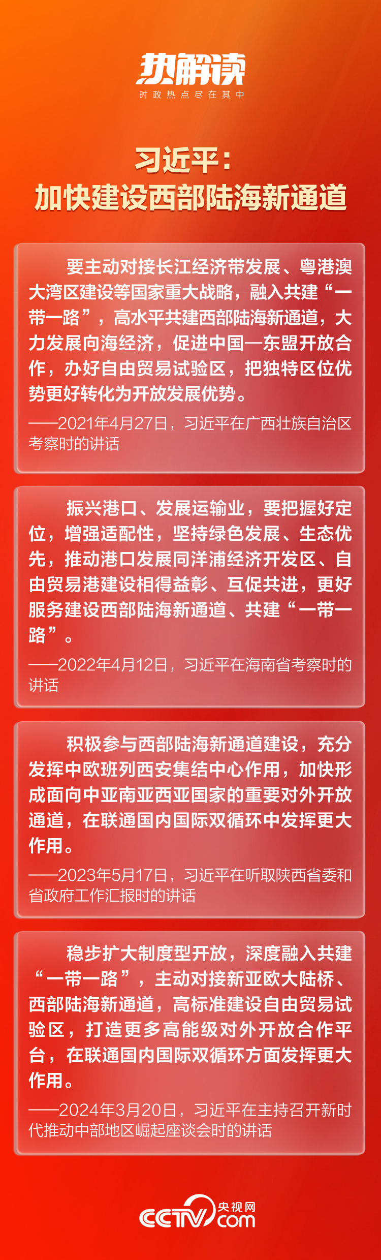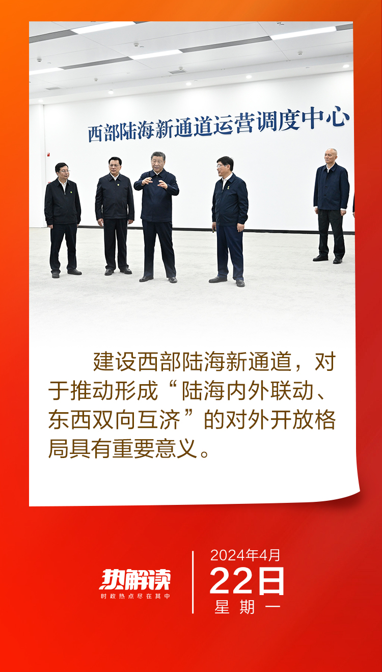 总书记一直对这条通道的建设十分关切。近年来,总书记在贵州、陕西、广西等西部陆海新通道沿线省区考察时,多次对高水平共建西部陆海新通道作出重要指示。