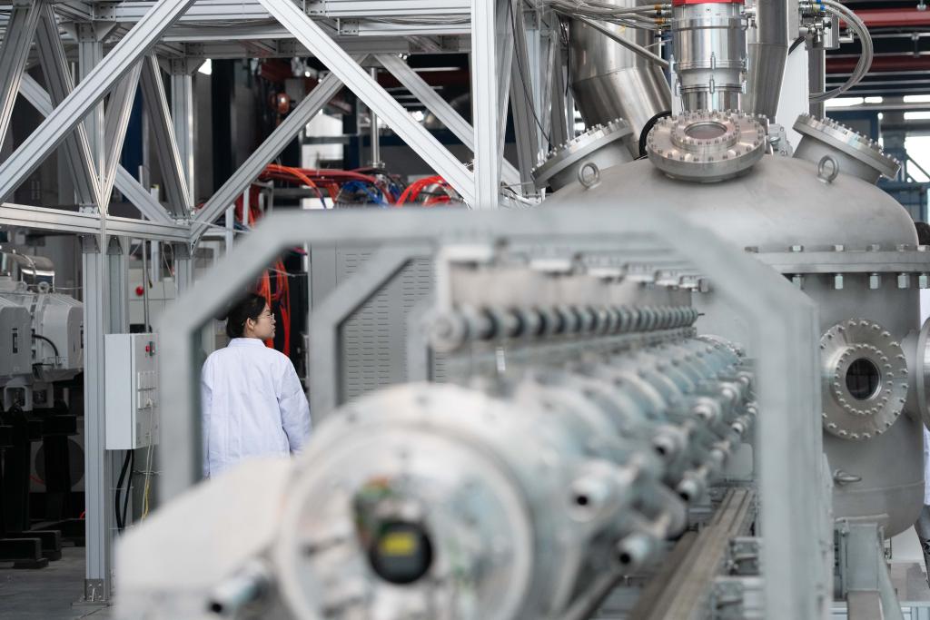 2025年1月14日,在位于中国安徽省合肥市的聚变堆主机关键系统综合研究设施(CRAFT)园区内,科研人员在巡看强流直线等离子体装置“赤霄”的运行状态。新华社记者 张端 摄