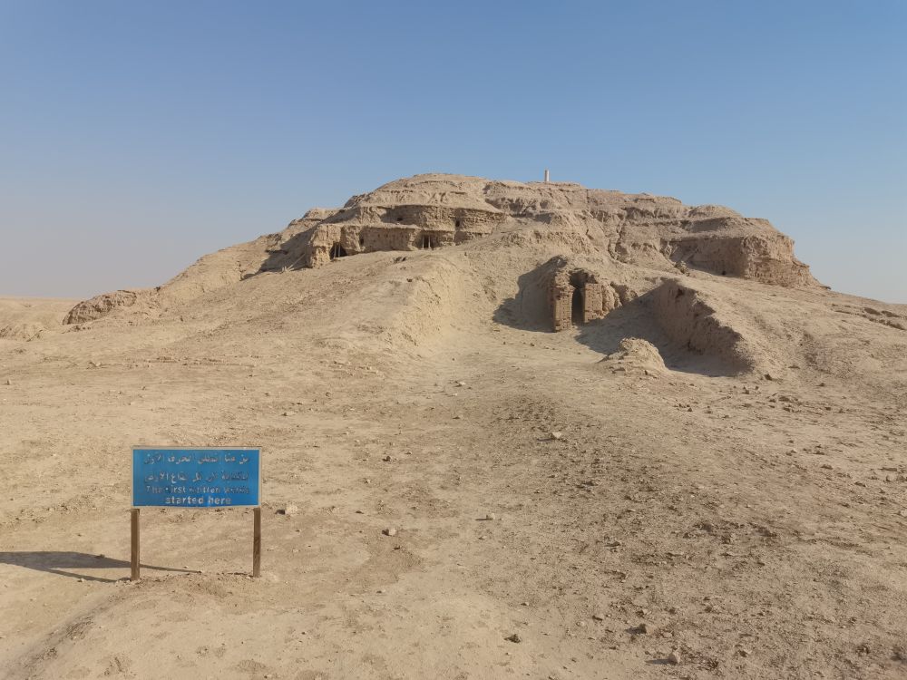 在乌鲁克古城遗址,一块锈迹斑斑的指示牌上写着“人类文字诞生于此”。图片均为段敏夫摄