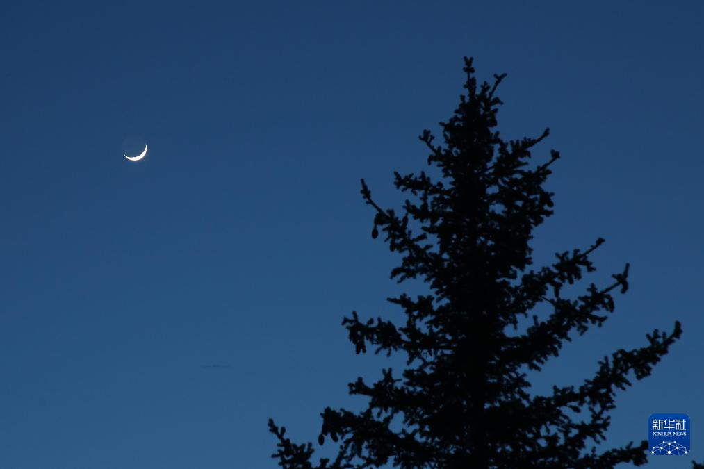 4月1日在黑龙江省大兴安岭地区呼玛县拍摄的“年度最大蛾眉月”。