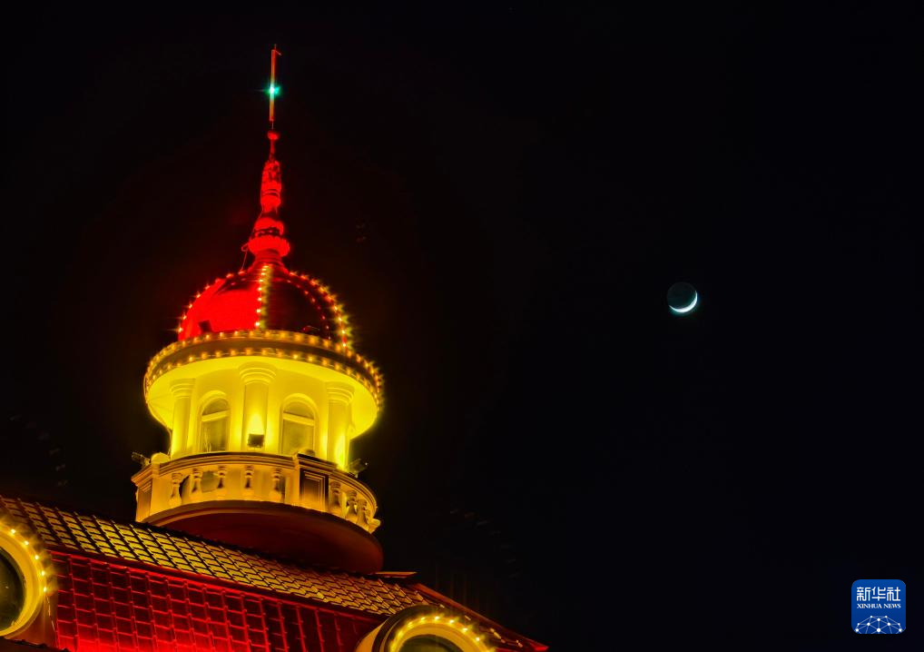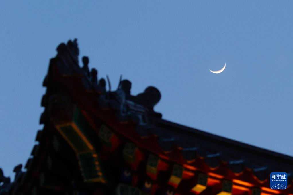 4月1日在黑龙江省北安市拍摄的“年度最大蛾眉月” 。
