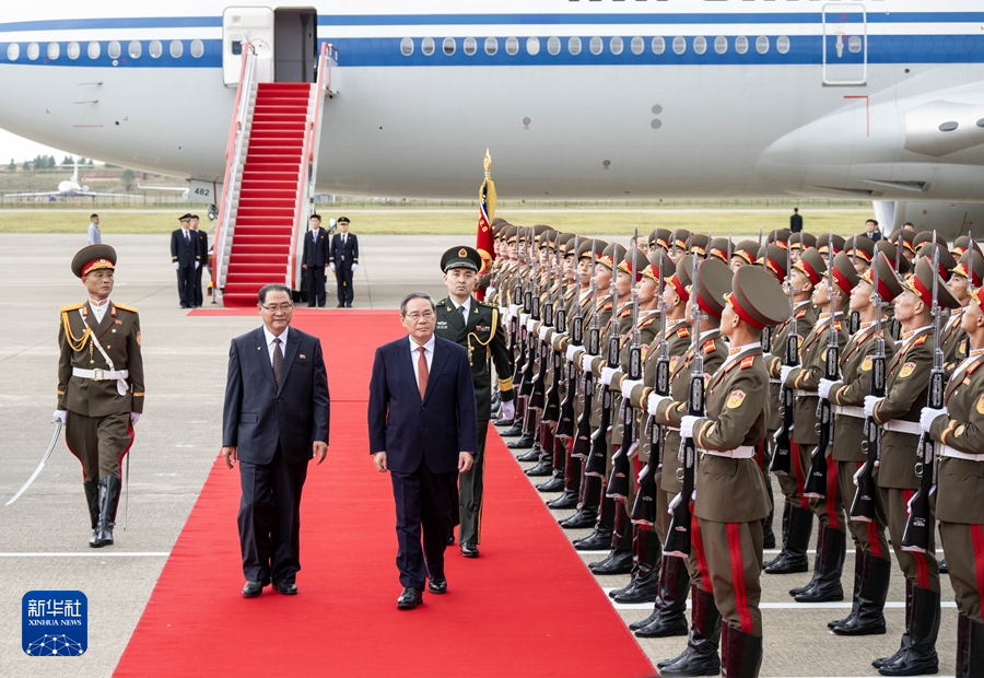 当地时间10月9日中午,李强乘包机抵达平壤顺安国际机场。朝鲜劳动党中央政治局常委、内阁总理朴泰成率党和政府高级官员到机场迎接,并为李强举行欢迎仪式。这是李强在朴泰成陪同下检阅仪仗队。新华社记者 翟健岚 摄
