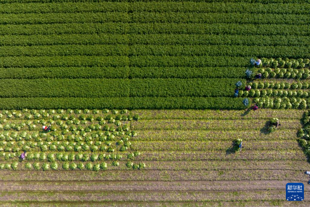 3月18日,浙江省余姚市黄家埠镇横塘村农民在田间收割芥菜(无人机照片)。新华社发(张辉摄)