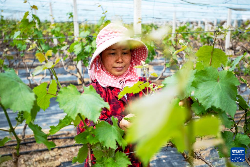 3月18日,农民在广西南宁市青秀区长塘镇双季葡萄产业园护理葡萄。新华社发(赵京武摄)