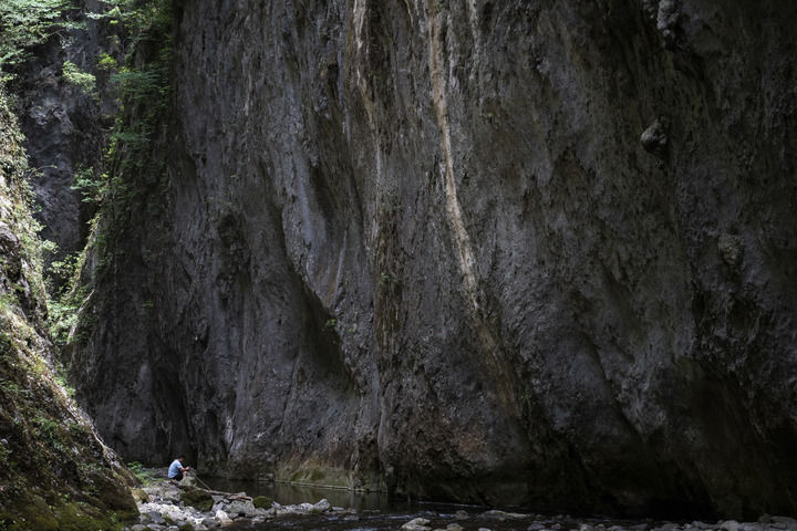 武陵峡总共5段一线天中有4段集中在上游。自上而下,我们踩着青苔覆盖的鹅卵石,小心翼翼穿过狭窄的五道峡。在阳光也无法穿透的谷底,即使穿着短裤,也被一潭碧水洇湿了裤脚。抬头仰视,但见两岸近乎90度的绝壁上几乎寸草不生,犹有一些灌木虬曲昂扬,展现出绝处逢生的生命力。一处悬崖上水滴像瀑布银沙滴落下来,同行中有人一声大喊,水滴便加快加大下泄,形成了独特的“喊水泉”效应。