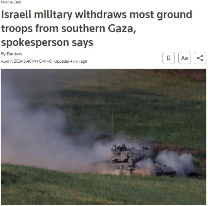 中新网4月7日电 据路透社消息,当地时间4月7日,以色列军方发言人表示,以军已从加沙地带南部撤出几乎所有地面部队,仅留下一个旅的人员。