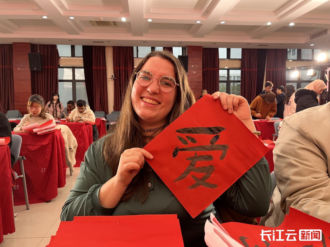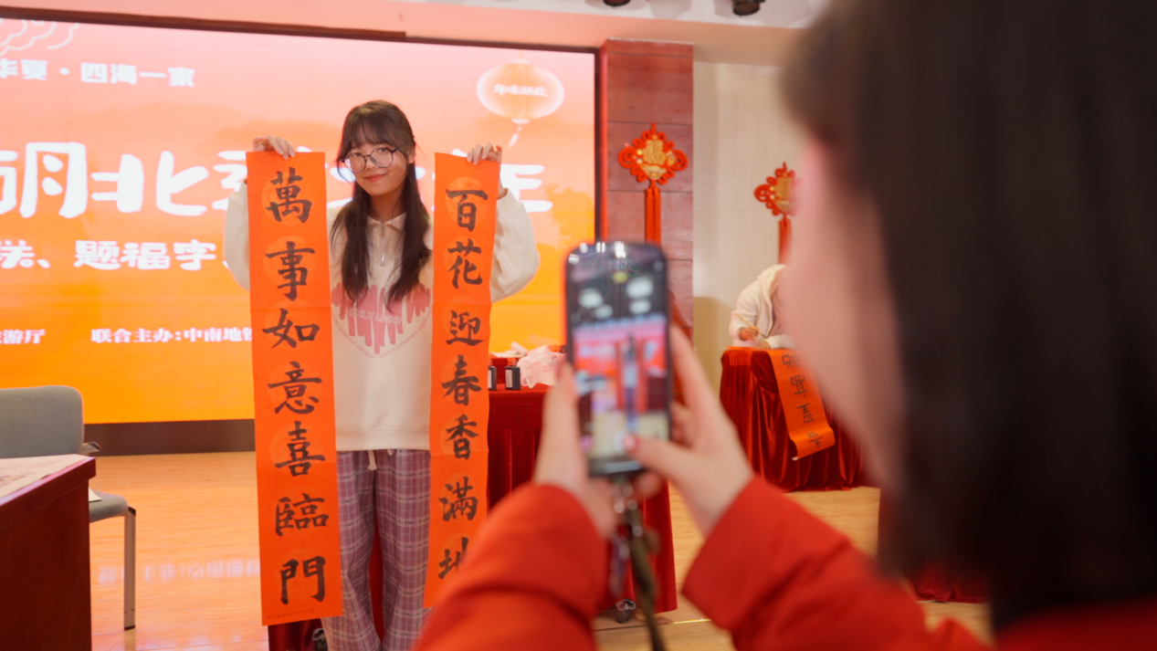 “四海皆春春不老,九州同乐乐无穷”“春风入喜财入户,岁月更新福满门”……每逢春节,中国人习惯将对新年的美好祝愿、对幸福生活的向往融入春联,贴于门楹。如今,这一传统习俗深受外国友人喜爱。活动现场,来自世界各地的留学生认真学习执笔姿势,相互交流书写心得,分享对春节习俗的理解,气氛热烈非凡。