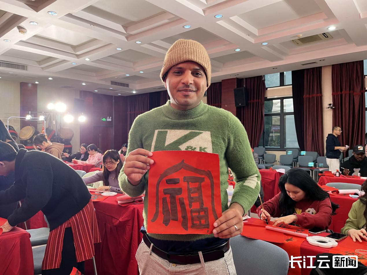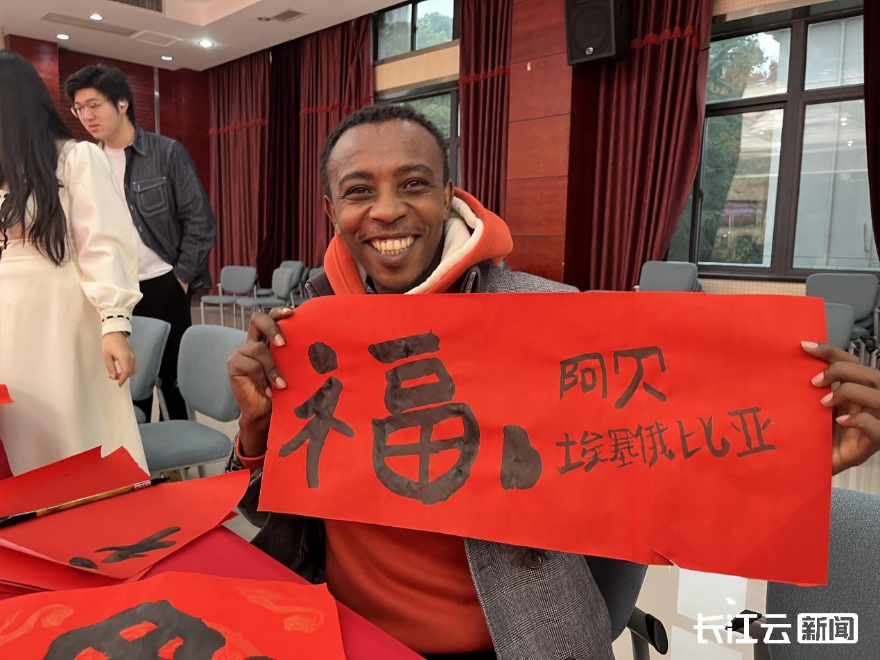 在老师指导下,留学生们不仅学写春联、福字,还深入了解春联的历史渊源与美好寓意。对于许多国际学生而言,这不仅是一堂书法课,更是一次跨文化的深刻体验。来自埃塞俄比亚的阿贝举着自己写的福字,笑着说:“这是我第一次写书法,感觉非常有仪式感。”