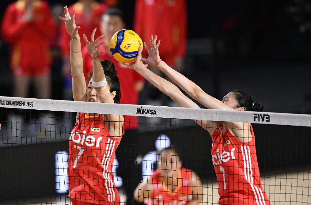8月27日,中国队球员王媛媛、吴梦洁(右)在比赛中拦网。新华社记者 侯昭康 摄
