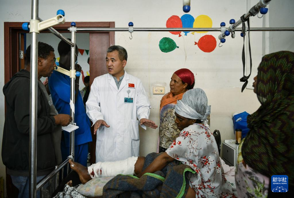 2月14日,在位于埃塞俄比亚首都亚的斯亚贝巴的蒂鲁内什-北京医院,中方骨科医生尚晨光与当地医生一起查房。