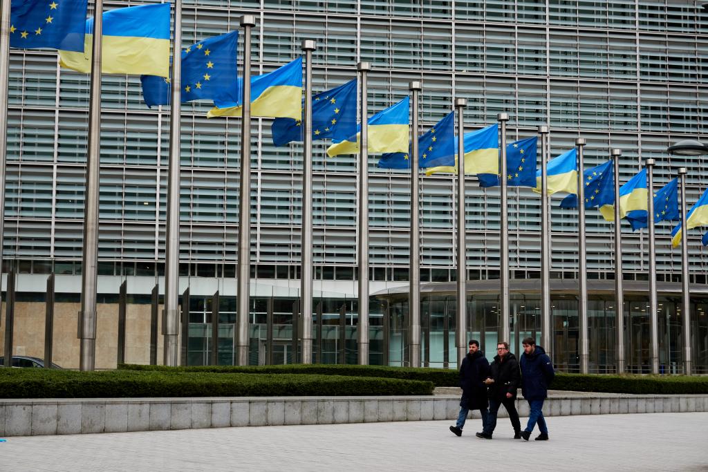 2025年2月24日,在比利时布鲁塞尔,人们走过欧盟总部。新华社记者孟鼎博摄