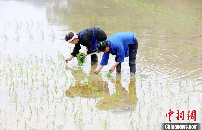 4月24日,在广西三江侗族自治县良口乡和里村,两名妇女在拔秧。龚普康 摄
