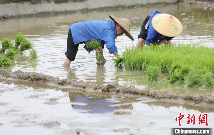 4月24日,在广西三江侗族自治县良口乡南寨村,两名村民在插秧。龚普康 摄