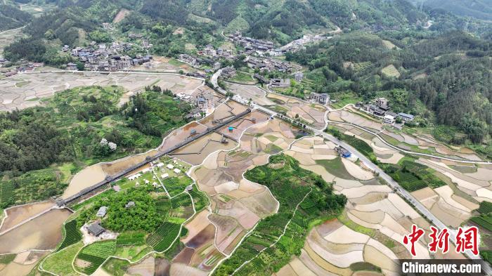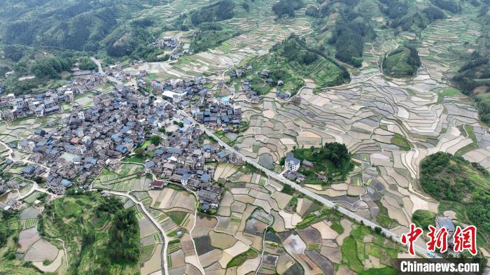 4月24日,航拍广西三江侗族自治县良口乡南寨村的田园美景。龚普康 摄