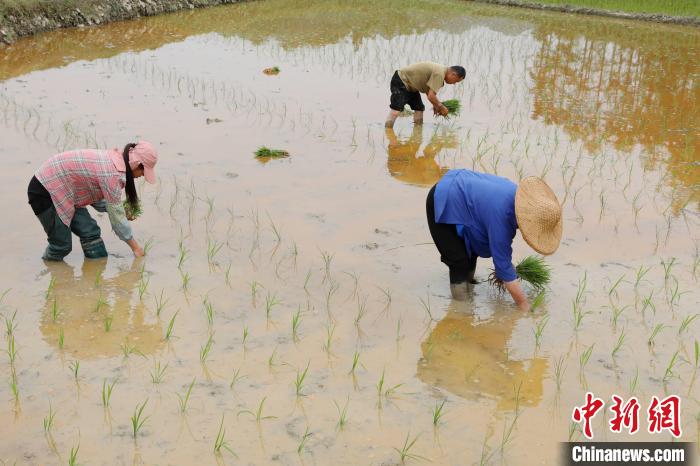 4月24日,在广西三江侗族自治县良口乡南寨村,几名村民在插秧。龚普康 摄