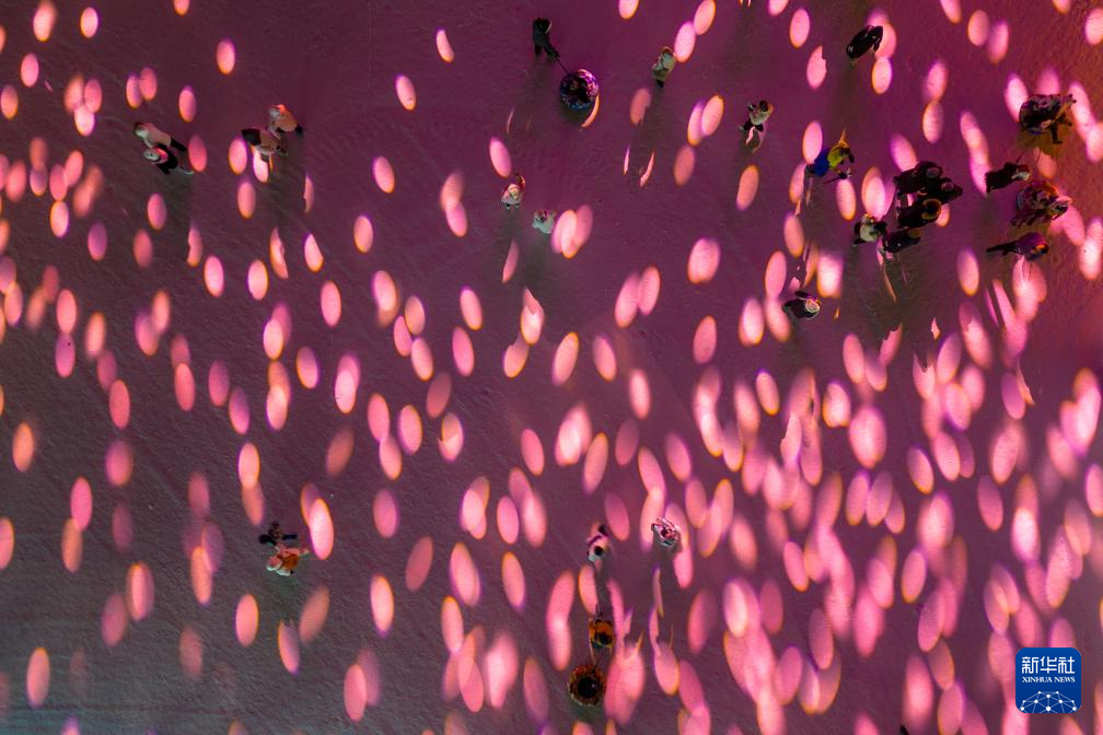 1月15日,游客在哈尔滨冰雪大世界园区内欣赏光影秀(无人机照片)。