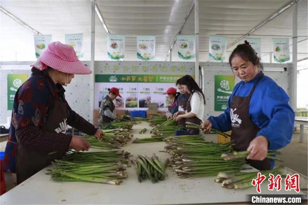 图为在位于江西省南昌市新建区石埠镇的南昌梦飞田园生态旅游开发有限公司内,工人们正在分拣芦笋。新建区融媒体中心供图