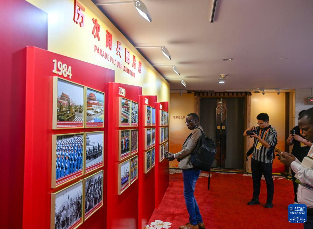 8月28日,记者在新闻中心参观历次阅兵图片展。