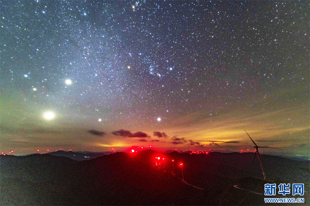初秋时节,贵州省从江县加榜乡达棒山风电场夜空澄澈,星河璀璨,朝霞如画,与山脊上耸立的风力发电机组构成一幅幅美丽画卷。