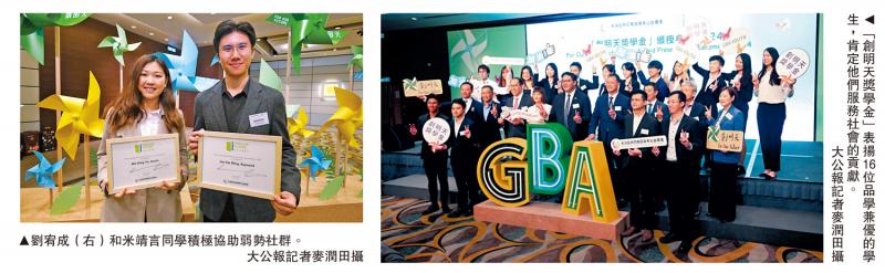 左图:刘宥成(右)和米靖言同学积极协助弱势社群。\大公报记者麦润田摄;右图:“创明天奖学金”表扬16位品学兼优的学生,肯定他们服务社会的贡献。\大公报记者麦润田摄