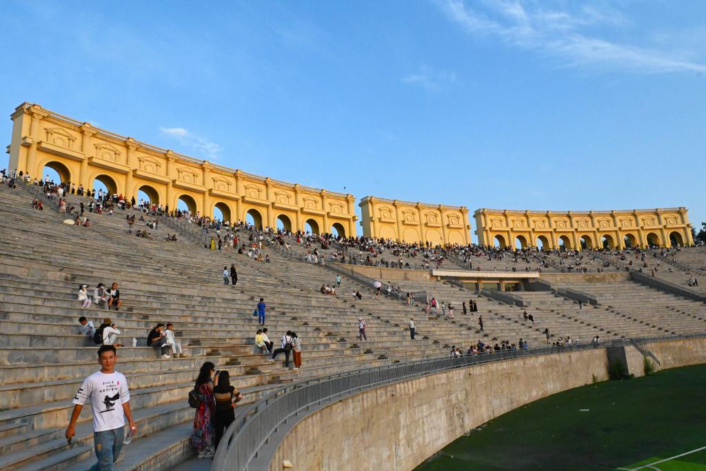 当太阳缓缓西沉,夕阳斜切过呈扇形排列的拱门长廊,在阶梯式看台上铺展出金红渐变的光影,仿佛一幅幻彩油画。远处的贺兰山轮廓清晰,山巅有云卷云舒;近处的阅海湖波光粼粼,湖中现鸥鸟盘旋……目之所及的一切都被晚霞镀上一层暖金色,展现着日落时分的独特魅力。游客们纷纷挑选最佳视角,或用镜头捕捉迷人风光,或记录与落日合影的美好瞬间。赏过落日余晖,如果不急着离开,就能与璀璨星河不期而遇,感受夜色下的静谧与浪漫。