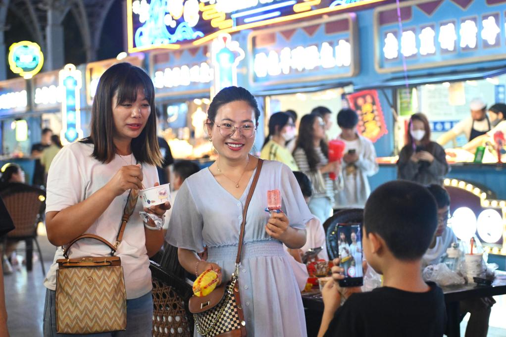 市民游客在览山夜市打卡留念。(资料照片,新华社记者毛竹 摄)