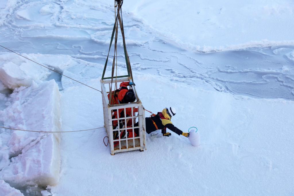 3月29日,科考队员乘吊笼到冰面布放浪-冰浮标和海冰漂流浮标。新华社记者 黄韬铭 摄