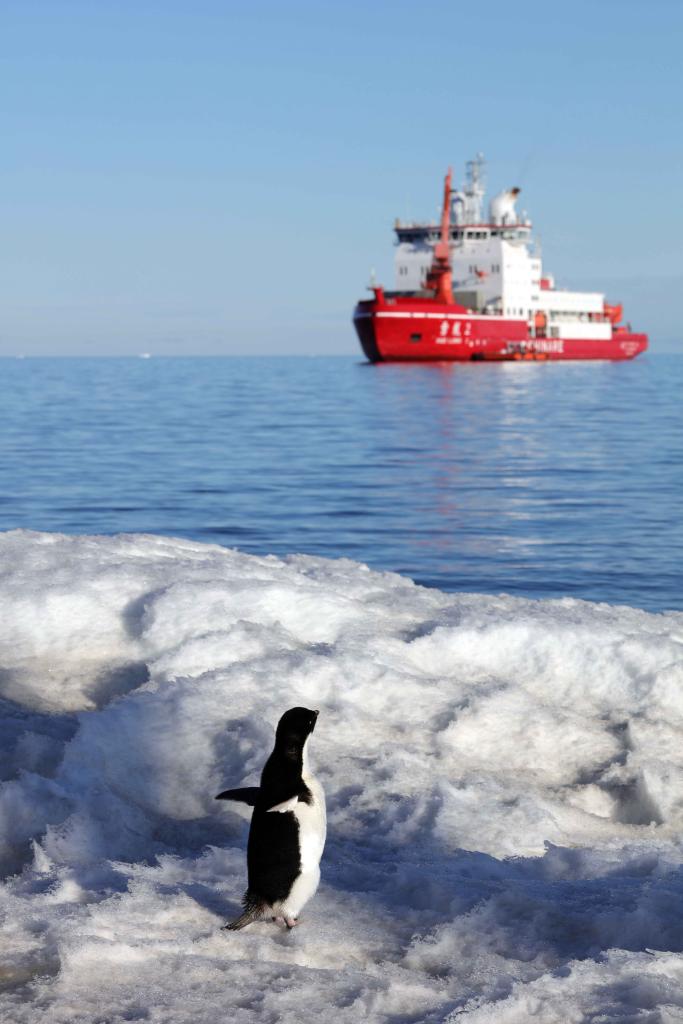 2024年12月27日,小企鹅遥望“雪龙2”号。新华社记者 黄韬铭 摄