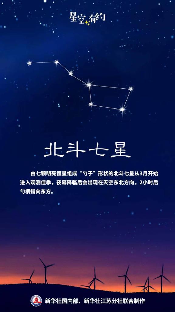 中国科学院紫金山天文台科普主管王科超介绍,春季观星,最好的起点就是寻找醒目的“路标”:北斗七星。对我国公众而言,由七颗明亮恒星组成“勺子”形状的北斗七星,从3月开始进入观测佳季,夜幕降临后会出现在天空东北方向,2小时后勺柄指向东方。古人正是根据这一天象判断季节。所谓“斗柄东指,天下皆春”,指的是在当时天黑后,看到北斗七星的斗柄指向正东方向,便知春天来临。