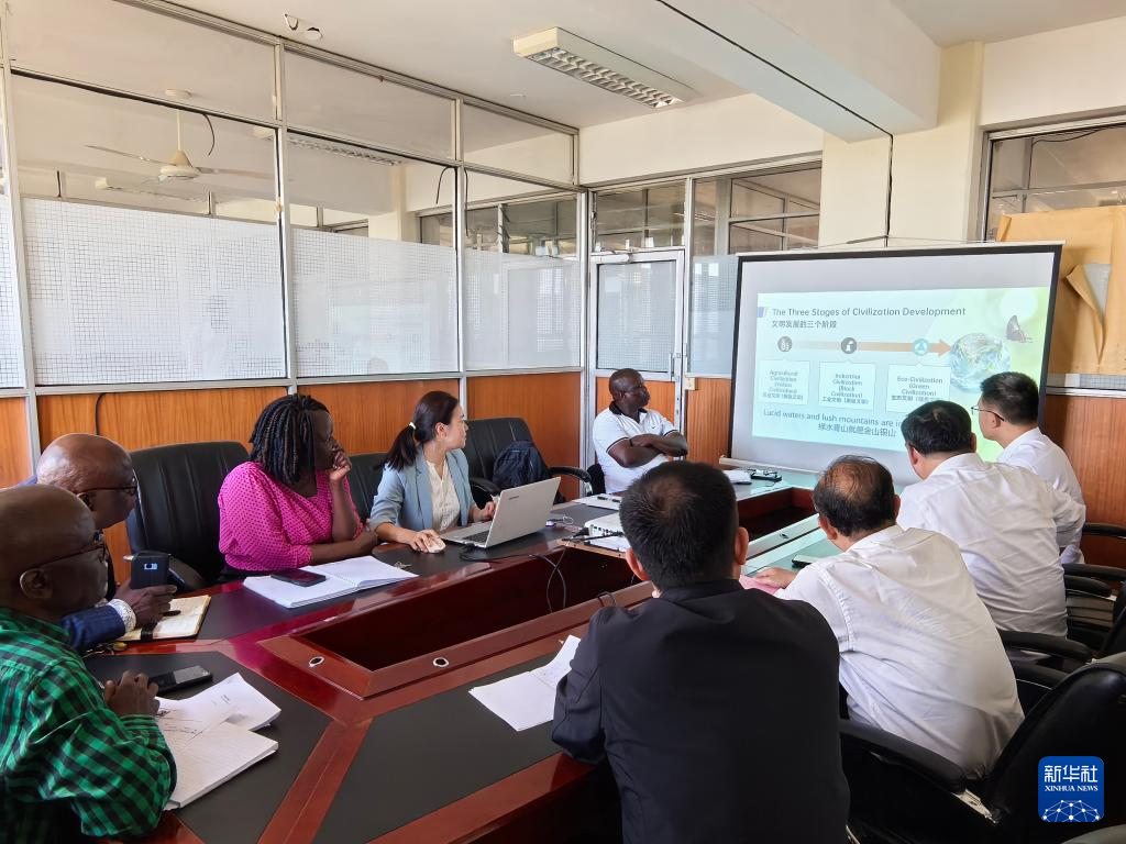 江西省生态文明研究院副研究员毛玉婷(后右二)在肯尼亚基苏木分享江西鄱阳湖流域的可持续发展经验(2024年8月27日摄,资料照片)。新华社发(江西省生态文明研究院供图)
