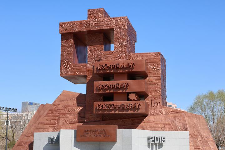 “爱国三问”碑的碑身以紫铜铸造,高10米,雕塑主体为“中国”二字,顶天立地、庄严肃穆。“国”字正中突出“爱国三问”主题字样,格外醒目。雕塑表面融入山水云纹及长城、泰山、牡丹等中华传统文化符号,基座四角设有荷花浮雕,寓意南开人的“君子品格”,基座台阶以南开系列学校的标志性八角校徽为造型,向心而收,层层汇聚到雕塑主体,寓意南开人“公能日新、爱国奋斗”的不变初心。