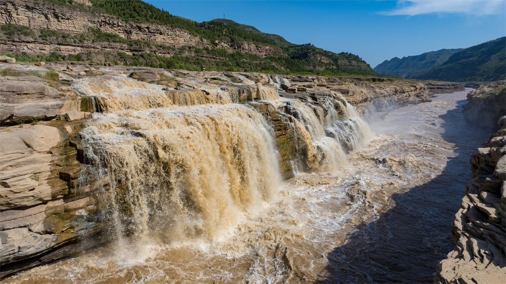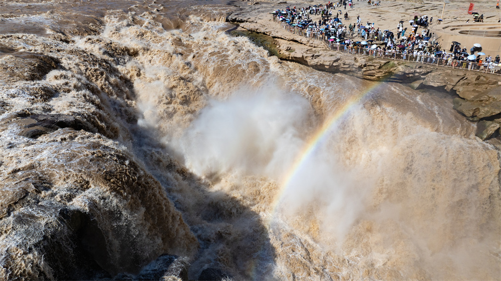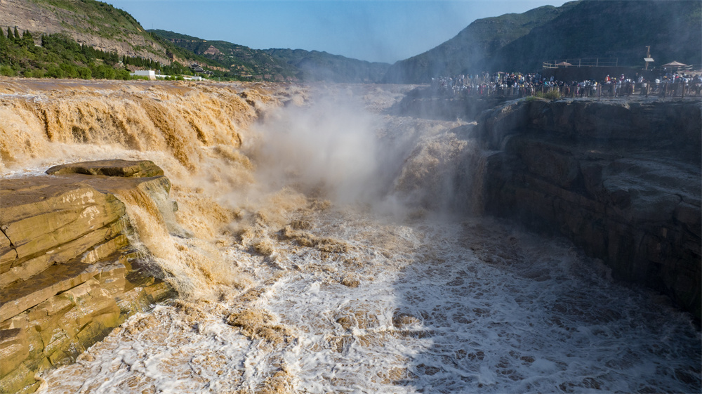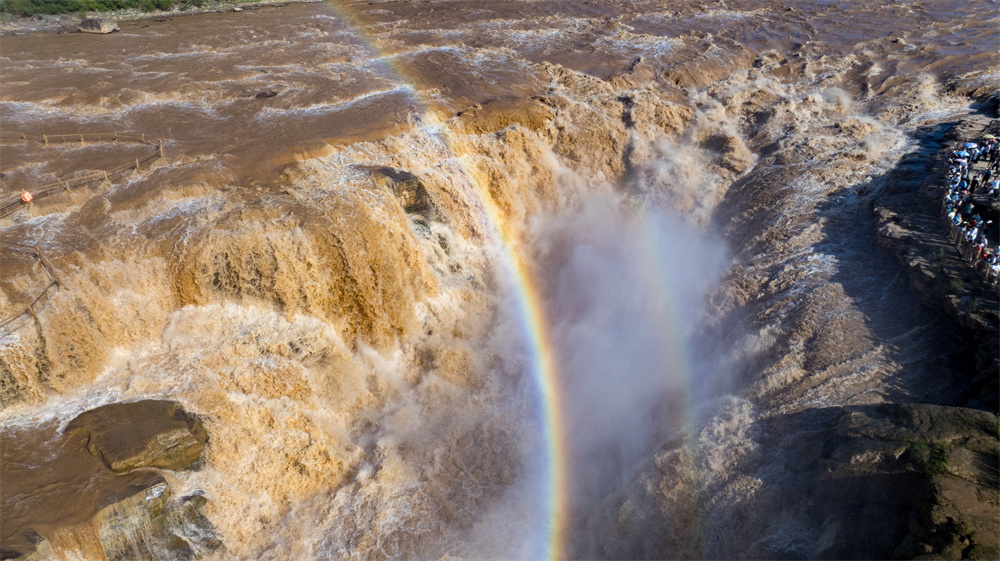奔腾的黄河壶口瀑布吸引众多游客前来观赏。近日,受天气晴好及水汽充足的影响,黄河壶口瀑布水量大增,金色黄河水汹涌奔腾,激起漫天水雾,气势磅礴,迎来最佳观赏期,吸引众多游客驻足观赏、拍照留念。(霍勇 宋洋波)