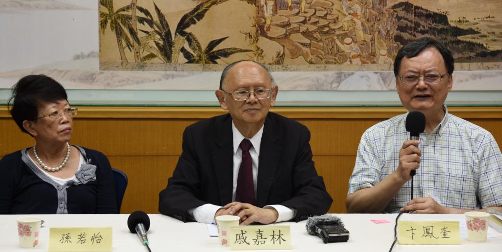 6月7日,台湾海洋大学教授卞凤奎(右)在台北举行的纪念抗日战争胜利与台湾光复80周年座谈会上发言。新华社记者 李建华 摄