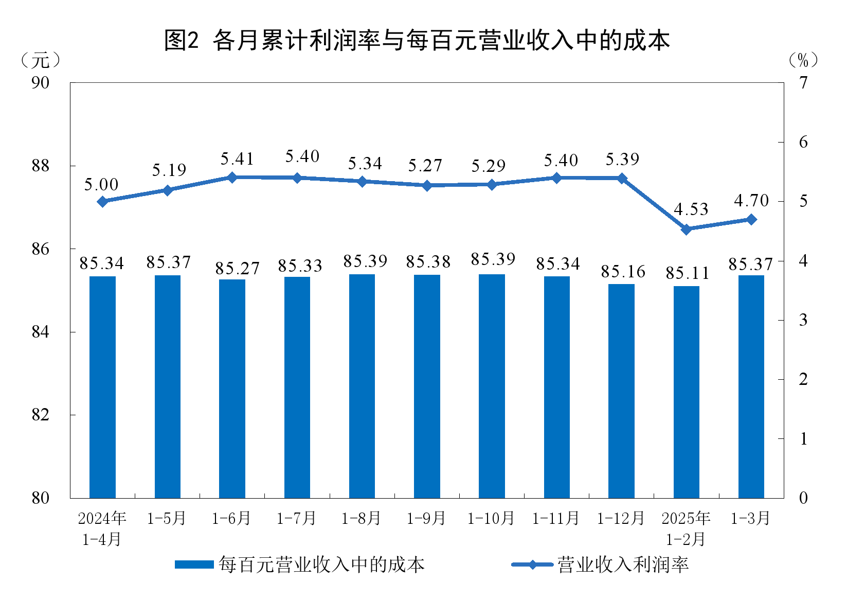 1—3月份,规模以上工业企业每百元营业收入中的成本为85.37元,同比增加0.17元;每百元营业收入中的费用为8.43元,同比减少0.16元。