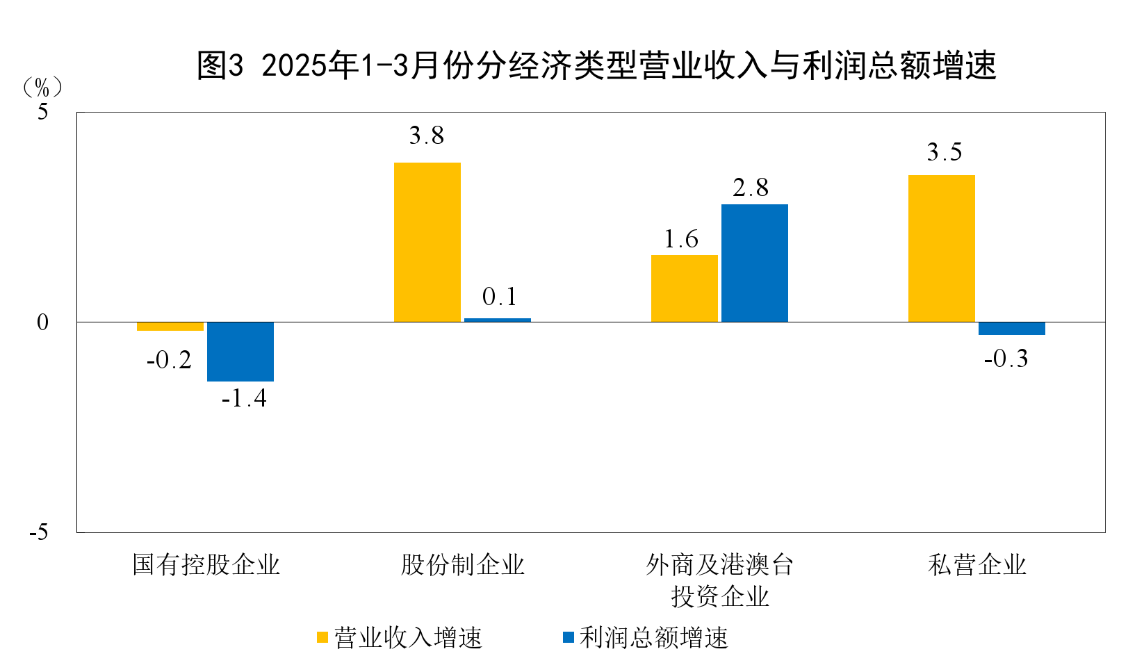 1—3月份,规模以上工业企业中,国有控股企业实现利润总额5599.5亿元,同比下降1.4%;股份制企业实现利润总额11101.5亿元,增长0.1%;外商及港澳台投资企业实现利润总额3883.5亿元,增长2.8%;私营企业实现利润总额3709.7亿元,下降0.3%。
