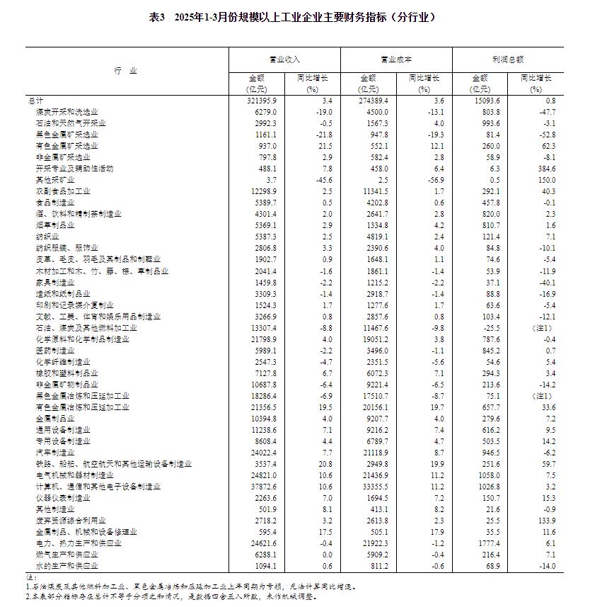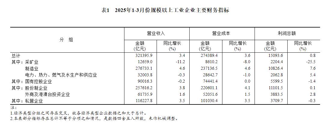 1—3月份,全国规模以上工业企业实现利润总额15093.6亿元,同比增长0.8%(按可比口径计算,详见附注二)。