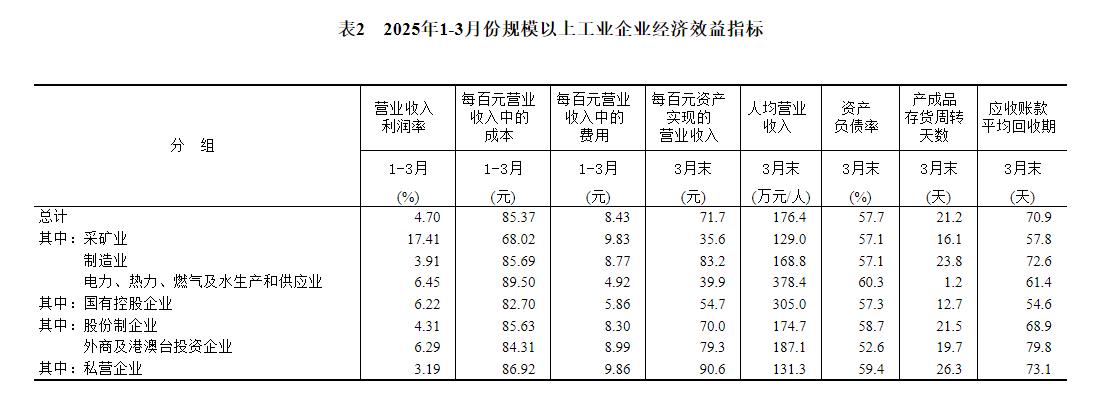 1—3月份,规模以上工业企业实现营业收入32.14万亿元,同比增长3.4%;发生营业成本27.44万亿元,增长3.6%;营业收入利润率为4.70%,同比下降0.12个百分点。
