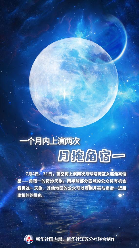 7月4日、31日,夜空将上演两次月球遮掩室女座最亮恒星——角宿一的奇妙天象。南半球部分区域的公众将有机会看见这一天象,其他地区的公众可以看到月亮与角宿一近距离相伴的景象。