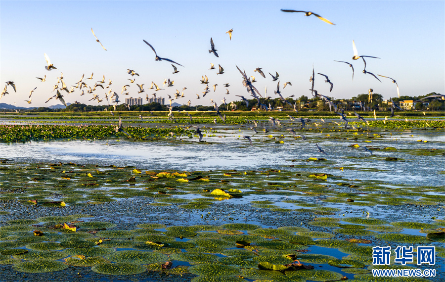 近日,安徽省合肥市庐江县黄陂湖湿地,荷花绽放,水鸟飞翔,呈现出一幅和谐的生态画卷。